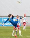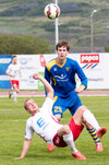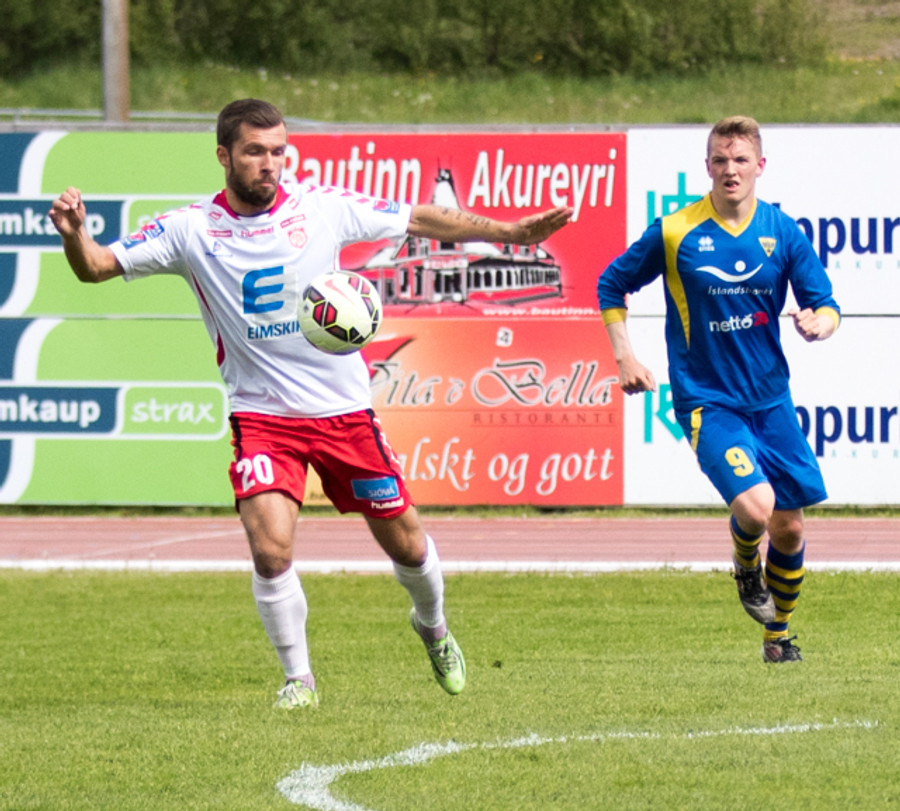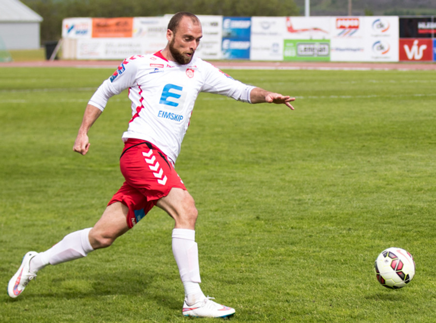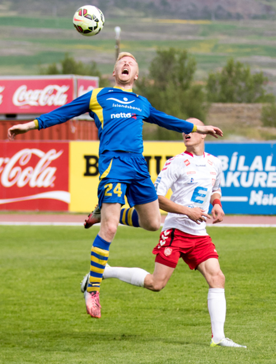 Jóhann Helgi með skalla framhjá markinu. Það er heldur betur að lifna yfir þessu hérna á Þórsvelli