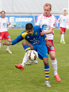 Jóhann fer full harkalega í Benis við hliðarlínuna en ekkert dæmt. Það er mikil harka í þessum leik