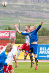 Gunnar Örvar með skalla sem fer beint á Árna í markinu. Heimamenn miklu betri eftir markið sem þeir fengu ásig. Kannski ekki annað hægt