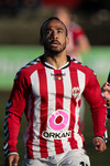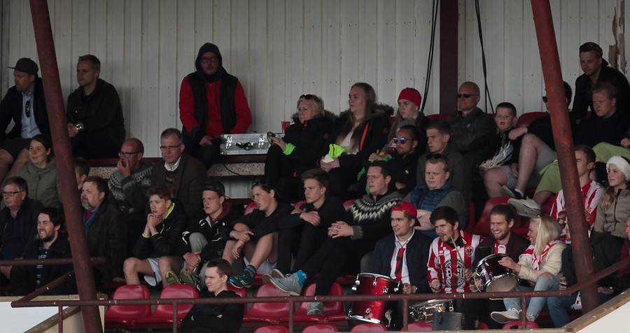 Hvet fótboltaáhugafólk til að skella sér á völlinn. Sólin skín og það er algjört logn. FLestir áhorfendur sem mættir eru hafa komið sér fyrir til hliðar við stúkuna enda er stúkan í skugga.