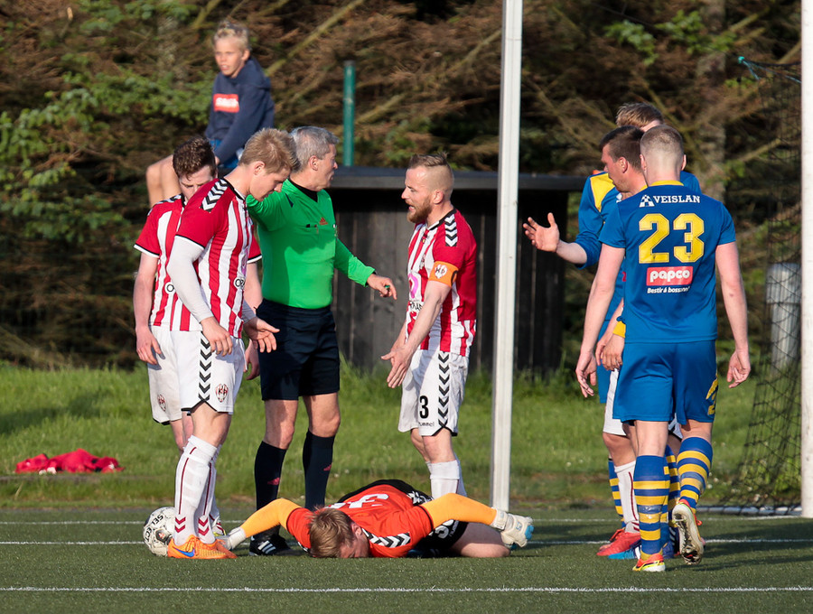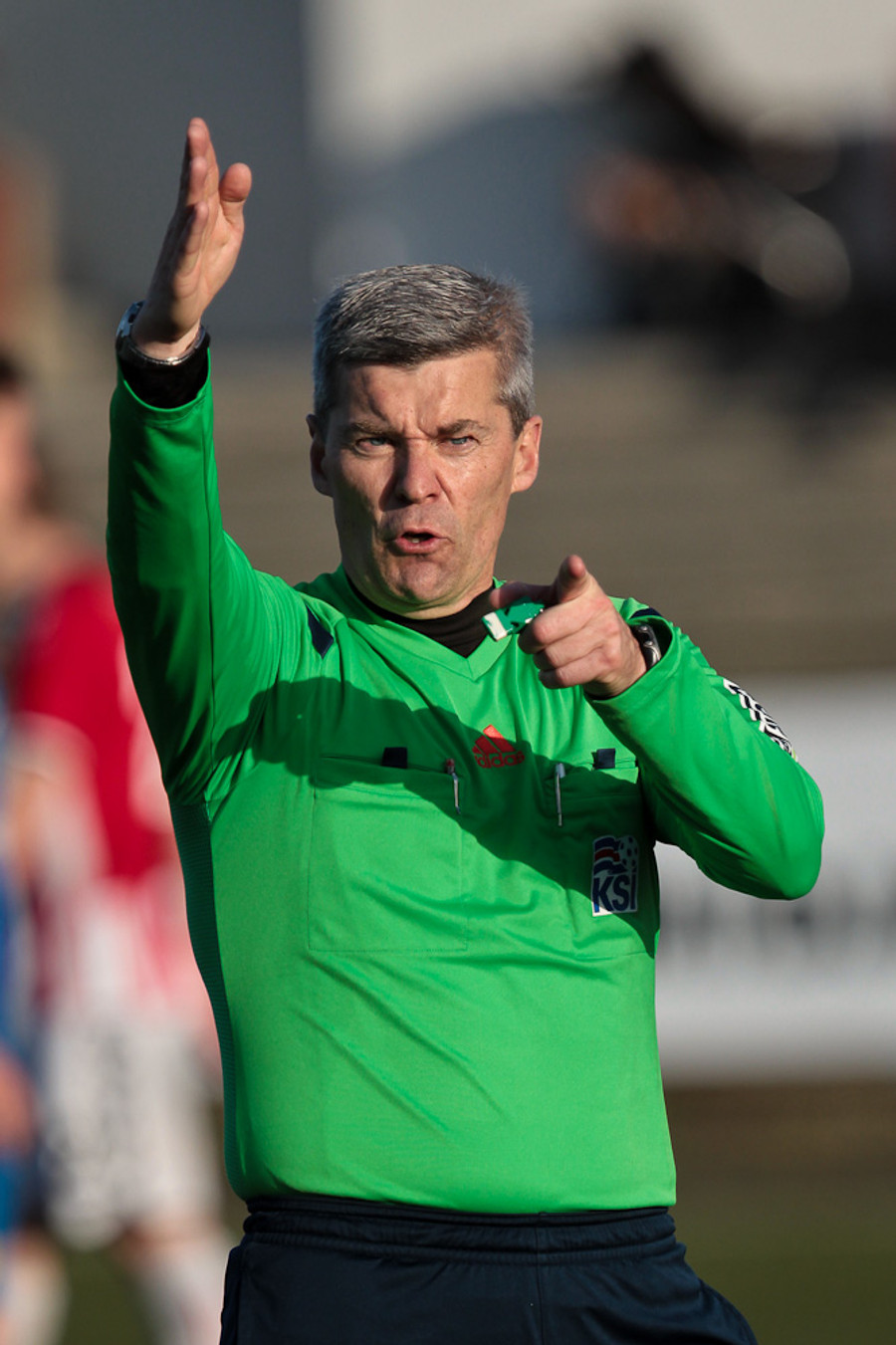 Liðin eru mætt út á völlinn. Fámennt á áhorfendapöllunum. Dómari kvöldsins kemur frá Akureyri og heitir Valdimar Pálsson.