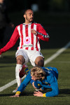 Fór af hörku í Trausta Sigurbjörnsson markvörð Þróttar sem þurfti aðhlynningu en er nú staðinn upp og heldur leik áfram.