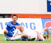Kristinn Freyr lá eftir á vellinum, í vítateig sinna manna og fór svo út að hliðarlínu til að fá aðhlynningu. En virðist vera á leið aftur inná.