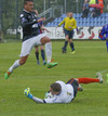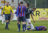 Sindri Kristinn liggur hér eftir á vellinum og þarf aðhlynningu eftir að lent í samstuði við Kolbein Kára.