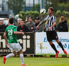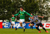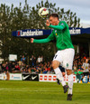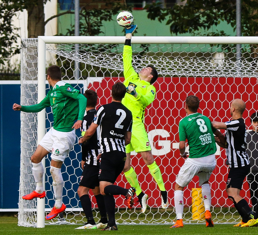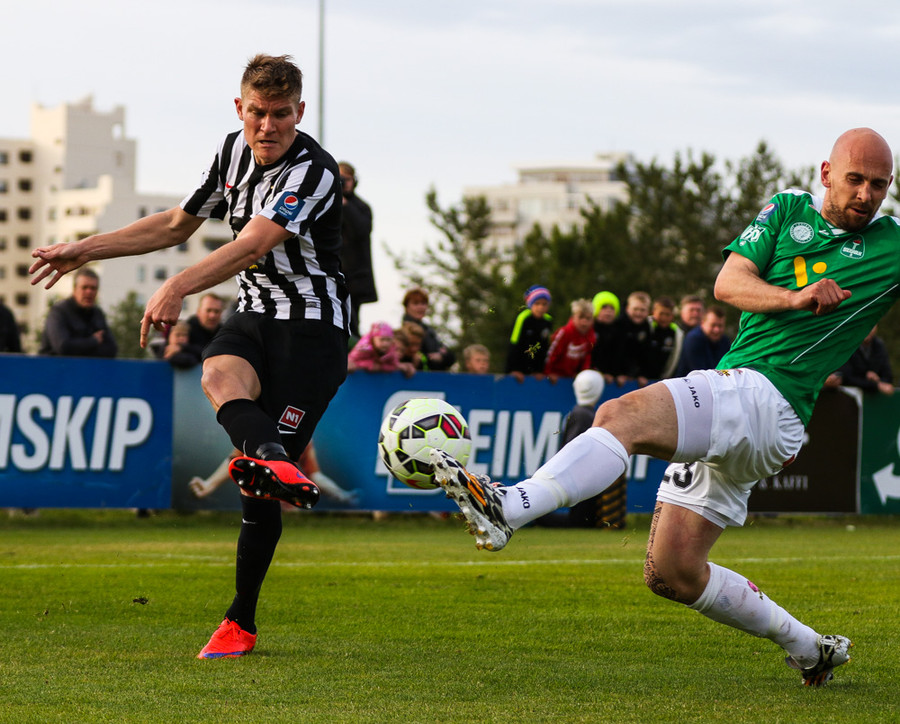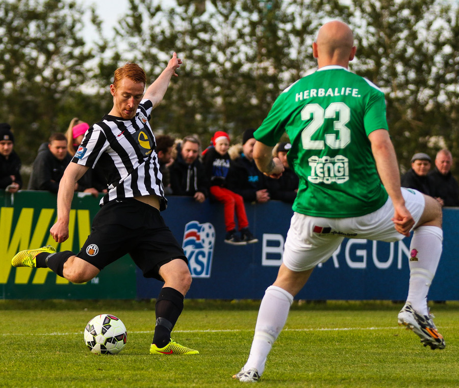 Kristinn Jónsson með stórhættulegan bolta fyrir markið sem Grétar þarf að skalla í horn.