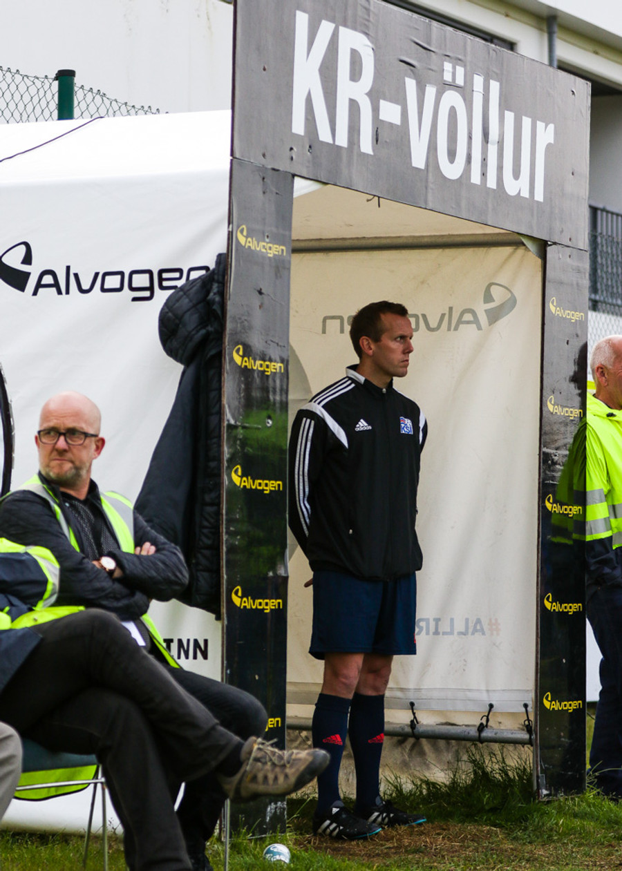 Bjarni Fel er mættur. Það er rosalega þæginlegt að vera á KR vellinum, ef maður missir af einhverju, þá er Bjarni Fel að lýsa leiknum við hliðina á manni fyrir KR útvarpið. Eðall.