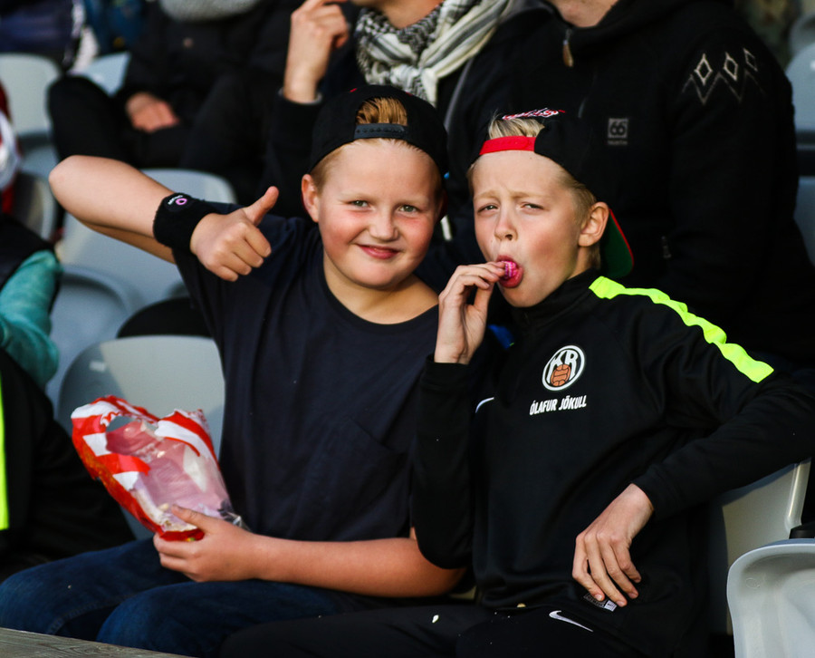 Atli Sigurjónsson reynir fasta sendingu fram völlinn sem fer beint í Þorvald dómara sem dettur á rassinn og allir í stúkunni fagna.