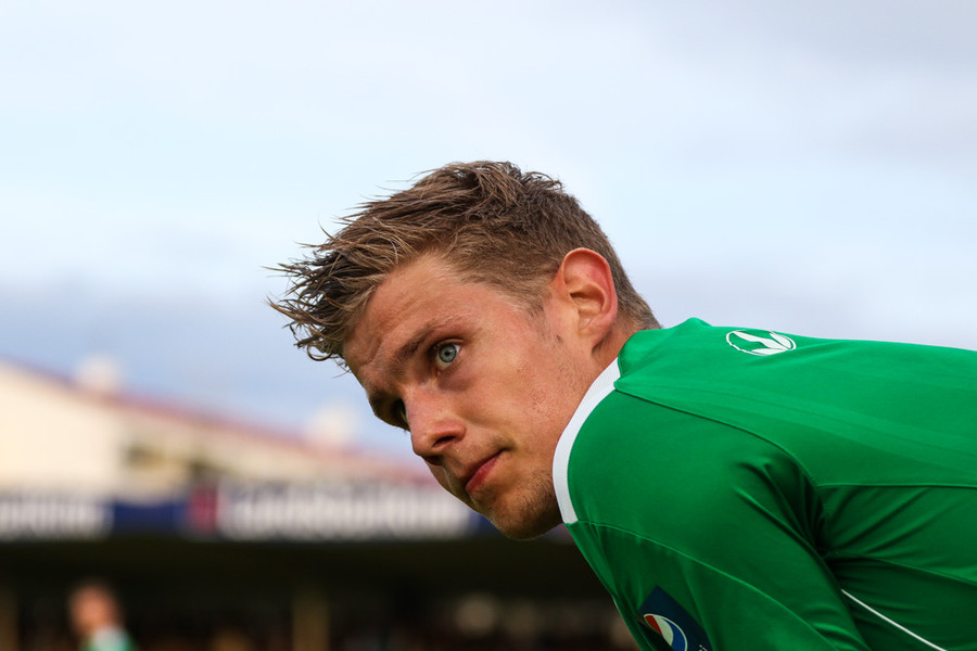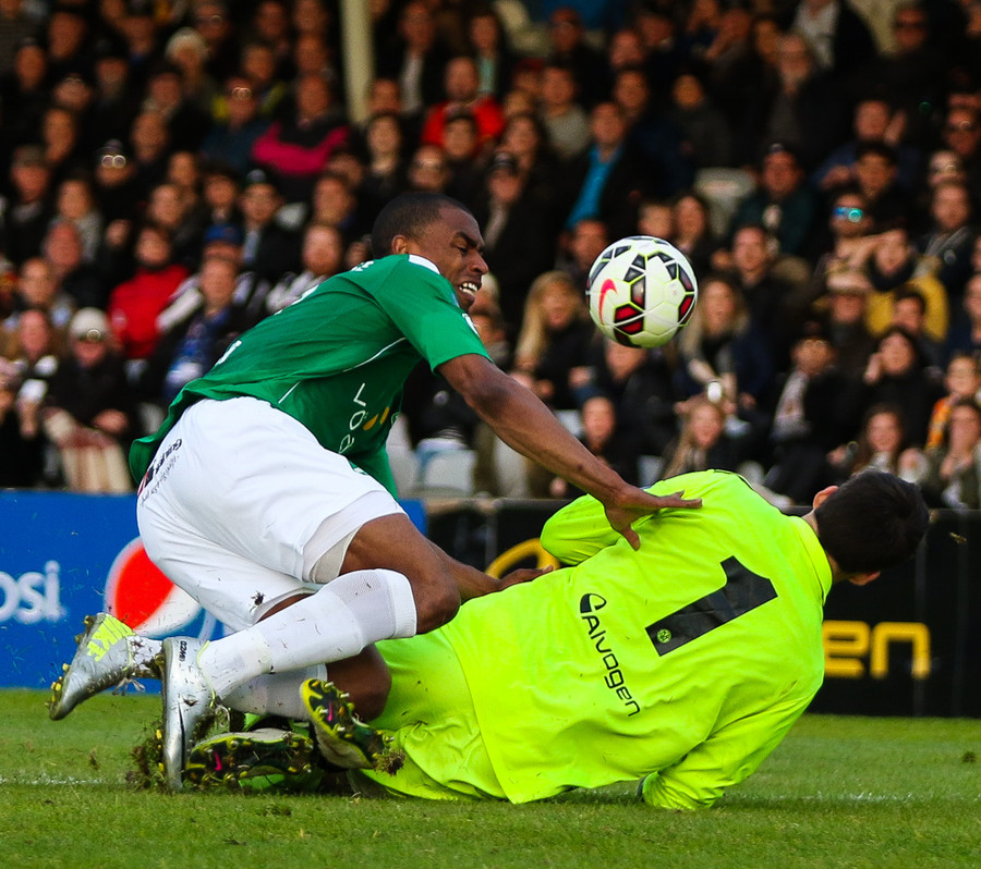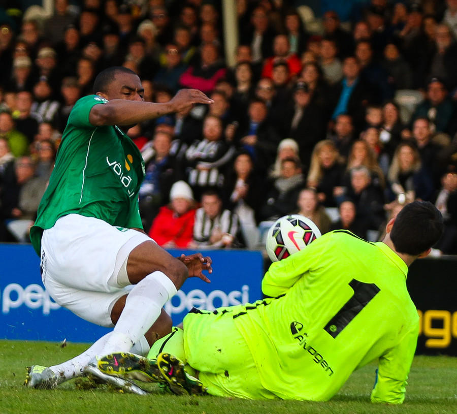 Jonathan Glenn kominn einn í gegn en hann tekur aðeins of fasta snertingu og Stefán Logi kemst í boltann. Þeim lendir síðan saman og Stefán liggur eftir meiddur. Þarna hefði Glenn átt að gera betur.