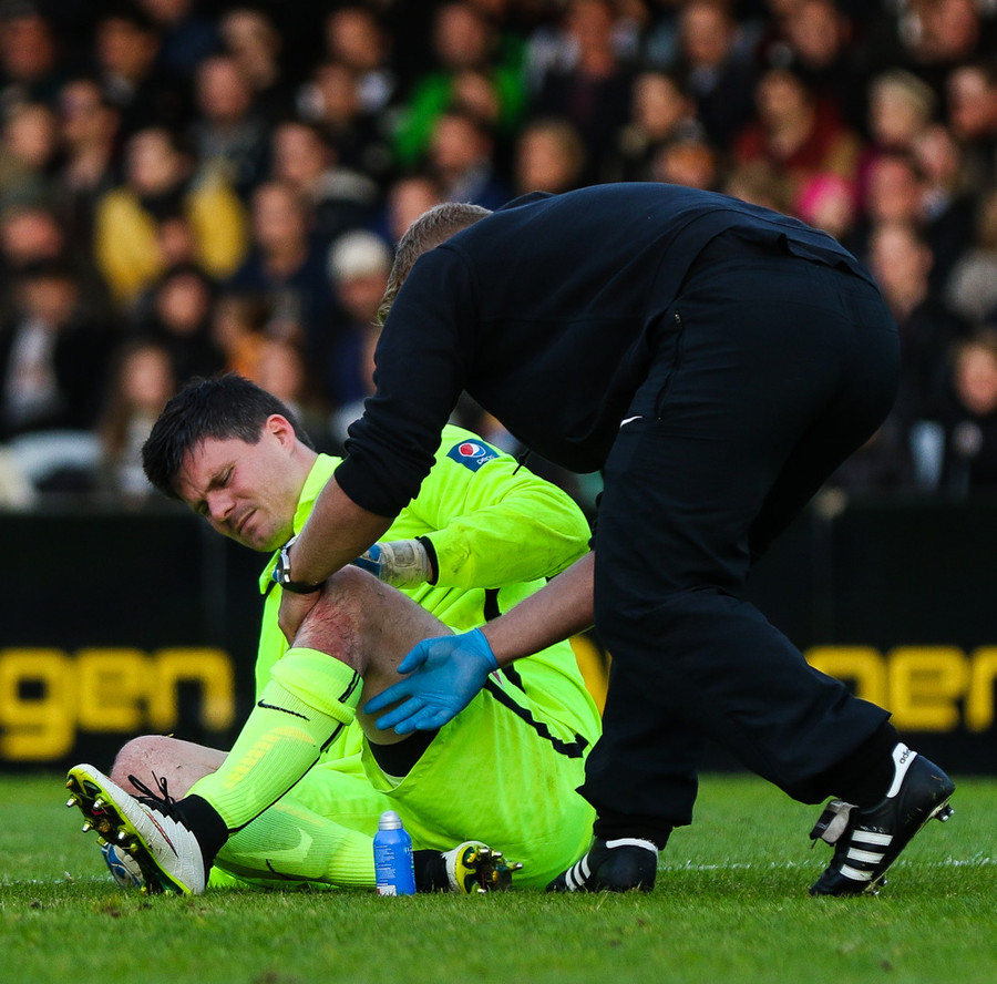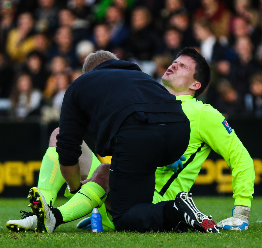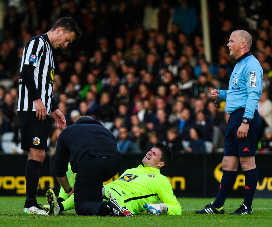 Pálmi Rafn hefur fengið eitthvað högg á höfuðið, leikurinn er stöðvaður og hann fær aðhlynningu. Hann virðst ætla að halda leik áfram.