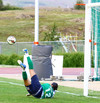 Jóhann Helgi dúndrar boltanum yfir með höfðinu eftir horn. Þessi braut glugga í Grímsey!