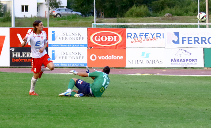 Þarna vildu Þórsarar víti! Sveinn Elías hljóp með boltann inn í teiginn og virtist hreinlega vera kippt niður. Sveinn var brjálaður við Ívar Orra og ég held að hann hafi haft eitthvað til síns máls.