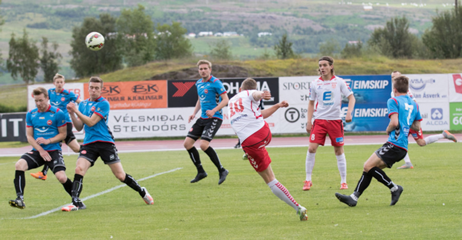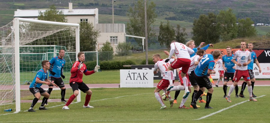 Beitir með frábæra markvörslu!!! Flott sending frá Inga beint á Jóhann sem skallar að marki en betir með frábæra markvörslu