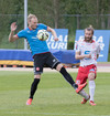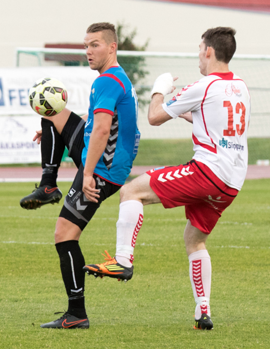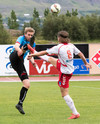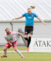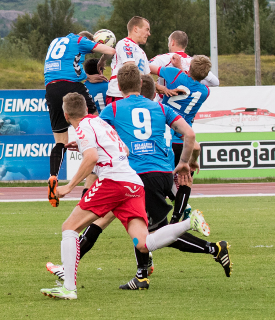 Balázs við það að komast í boltann eftir aukaspyrnu en Beitir kemst í boltann á undan