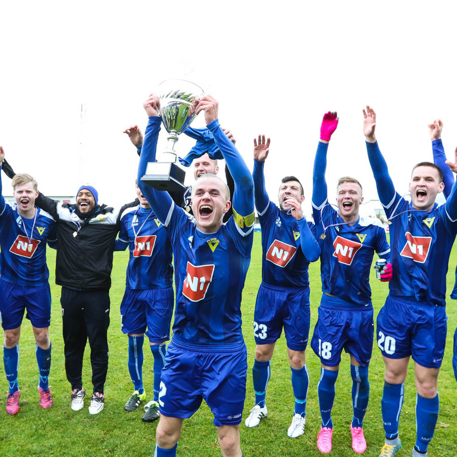 Styttist í að bikarinn fari á loft. Guðmundur Reynir, einn besti leikmaður liðsins í sumar lyftir honum eftir smá stund.