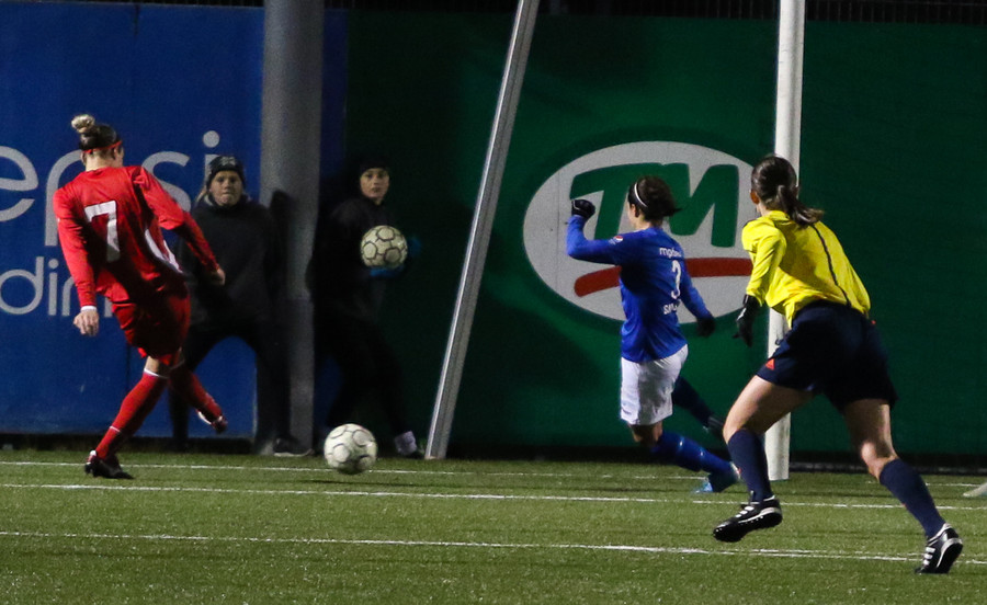 Nahi fer upp hægri kantinn og á sendingu á Kurochkina sem á lélegasta skot sem ég hef séð. Held boltinn sé einhverstaðar í trjánum fyrir aftan annað markið.