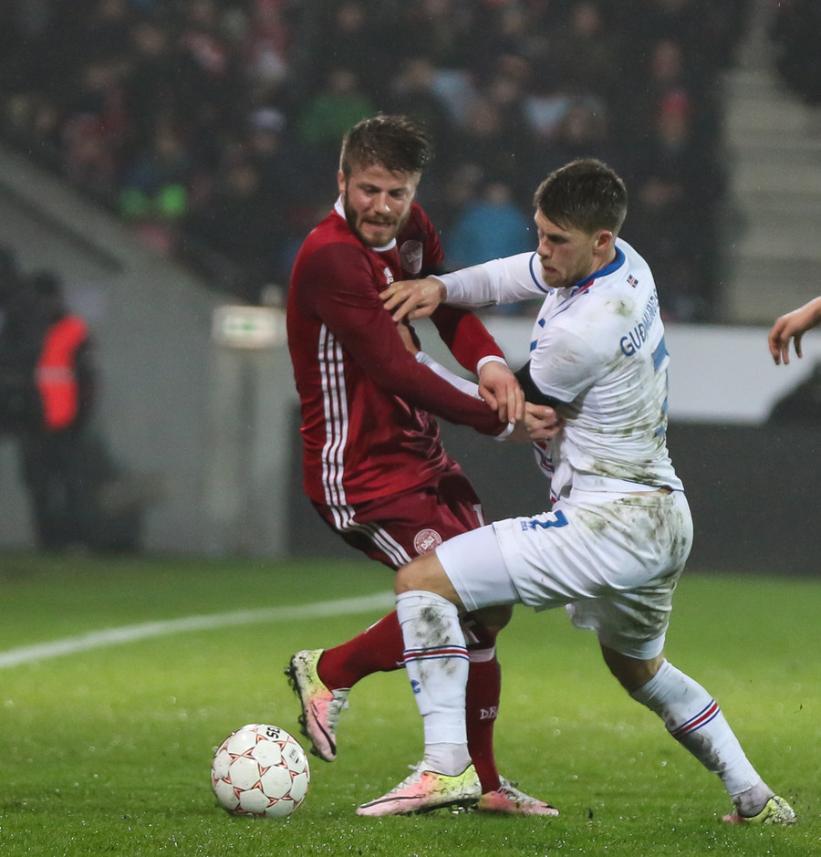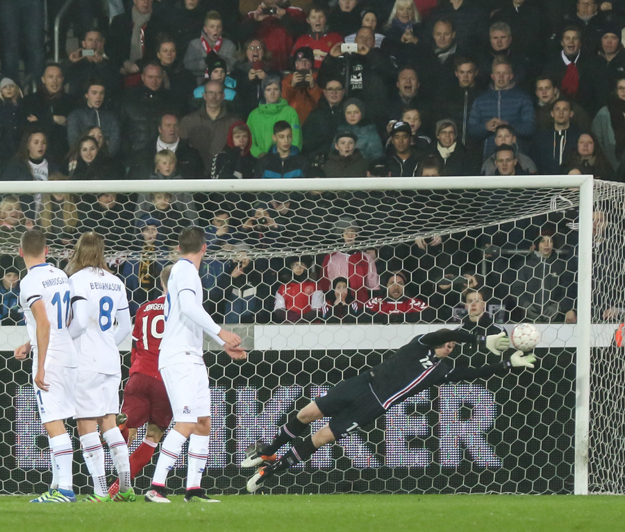 MARK!Eftir ágætis spil er Christian Eriksen kominn í færi vinstra megin í teignum. Hann sendir boltann framhjá Ögmundi og á Nicolai Jörgensen sem skorar auðveldlega í autt markið.