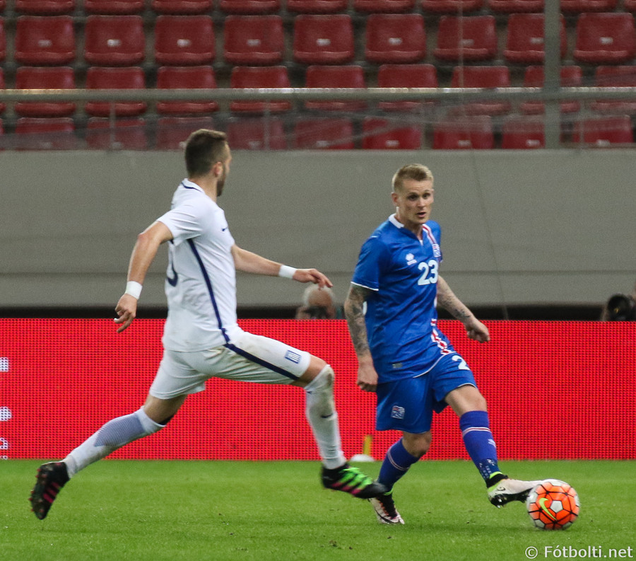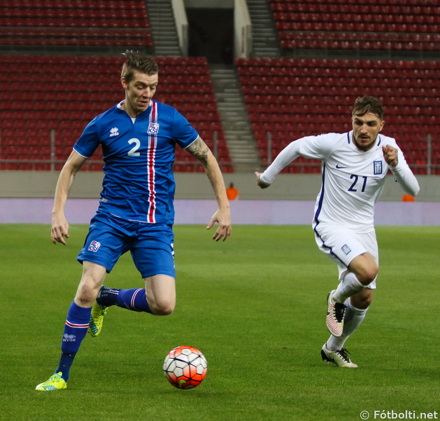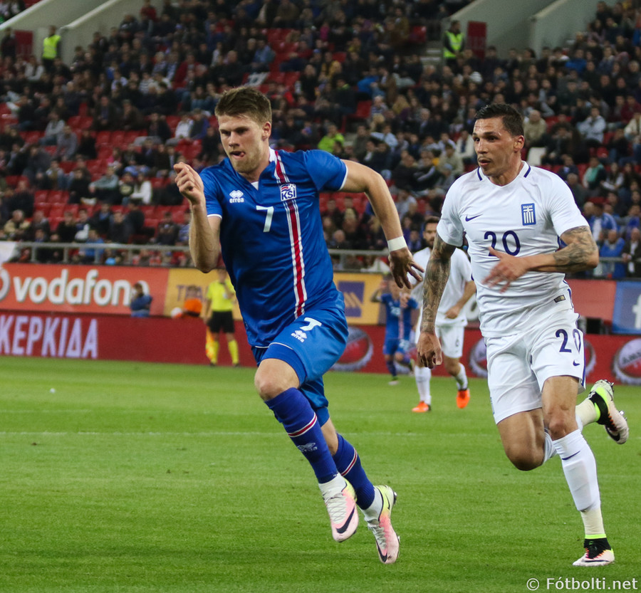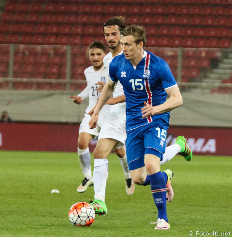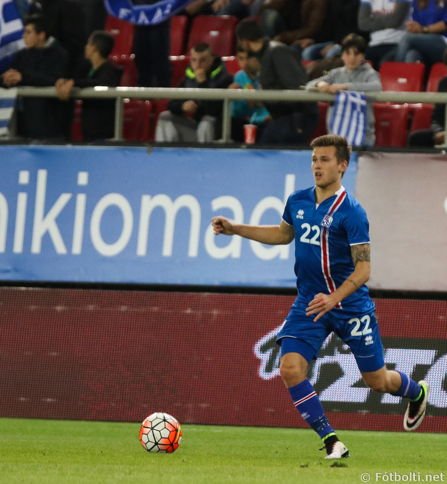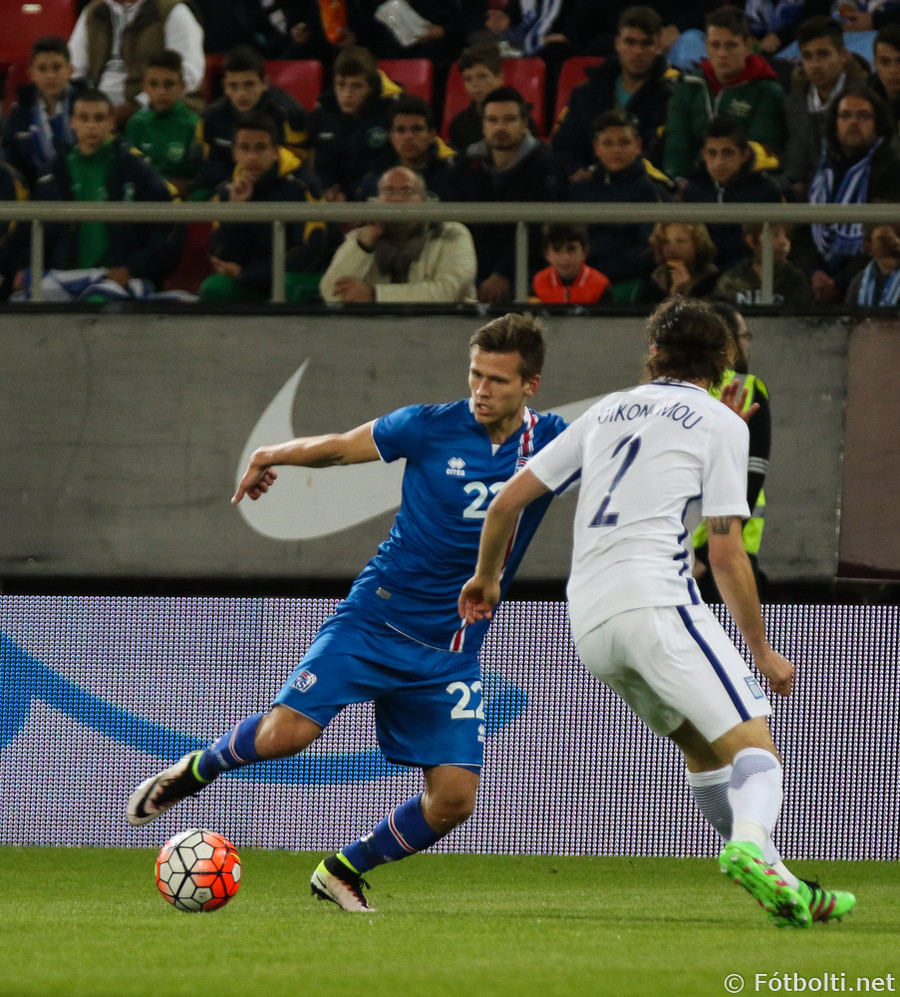 Grikkir eru oft opnir þegar Ísland nær skyndisóknum. Theodor Elmar setur boltann á Jóa Berg sem er að komast í dauðafæri en tækling númer tvö frá varnarmanni stöðvar för hans.