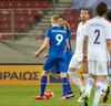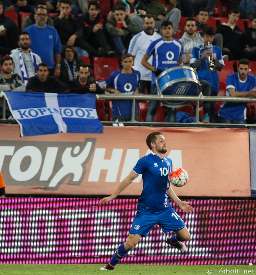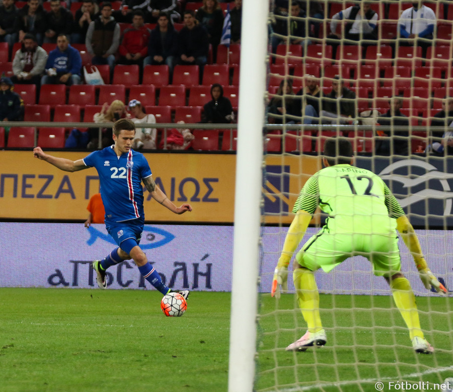 Váá! Ísland kemst í skyndisókn og Arnór Ingvi keyrir á fáliðaða vörn Grikkja. Hann leikur inn á miðjun og á skot frá vítateig sem smellur í slánni! Boltinn fer upp í loft og út í teiginn á Viðar Örn sem á viðstöðulaust skot á lofti en það fer talsvert framhjá.