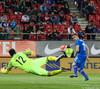 Jón Daði í þröngu færi eftir skyndisókn og sendingu frá Kolbeini en Stefanos Kapino slær skot hans í burtu.
