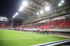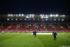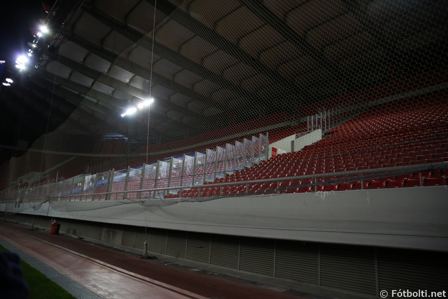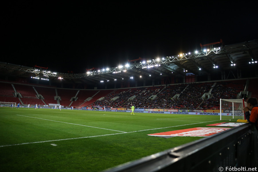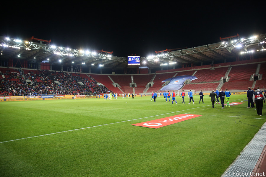 Korter í leik og mjög fámennt á pöllunum. Risa grísk treyja bakvið annað markið og hinumegin er "útiliðs" stúkan lokuð. Ef einhverjir Íslendingar eru á vellinum þá sitja þeir bara með Grikkjunum.