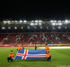 Þeir fáu áhorfendur sem eru mættir gera vel í að keyra stemninguna upp. Trommur, fánar og fjör.