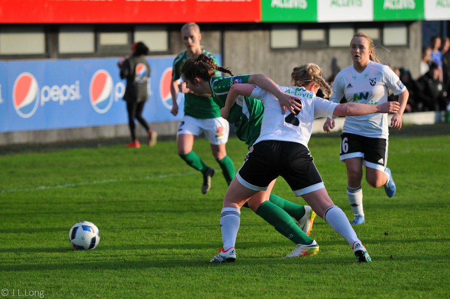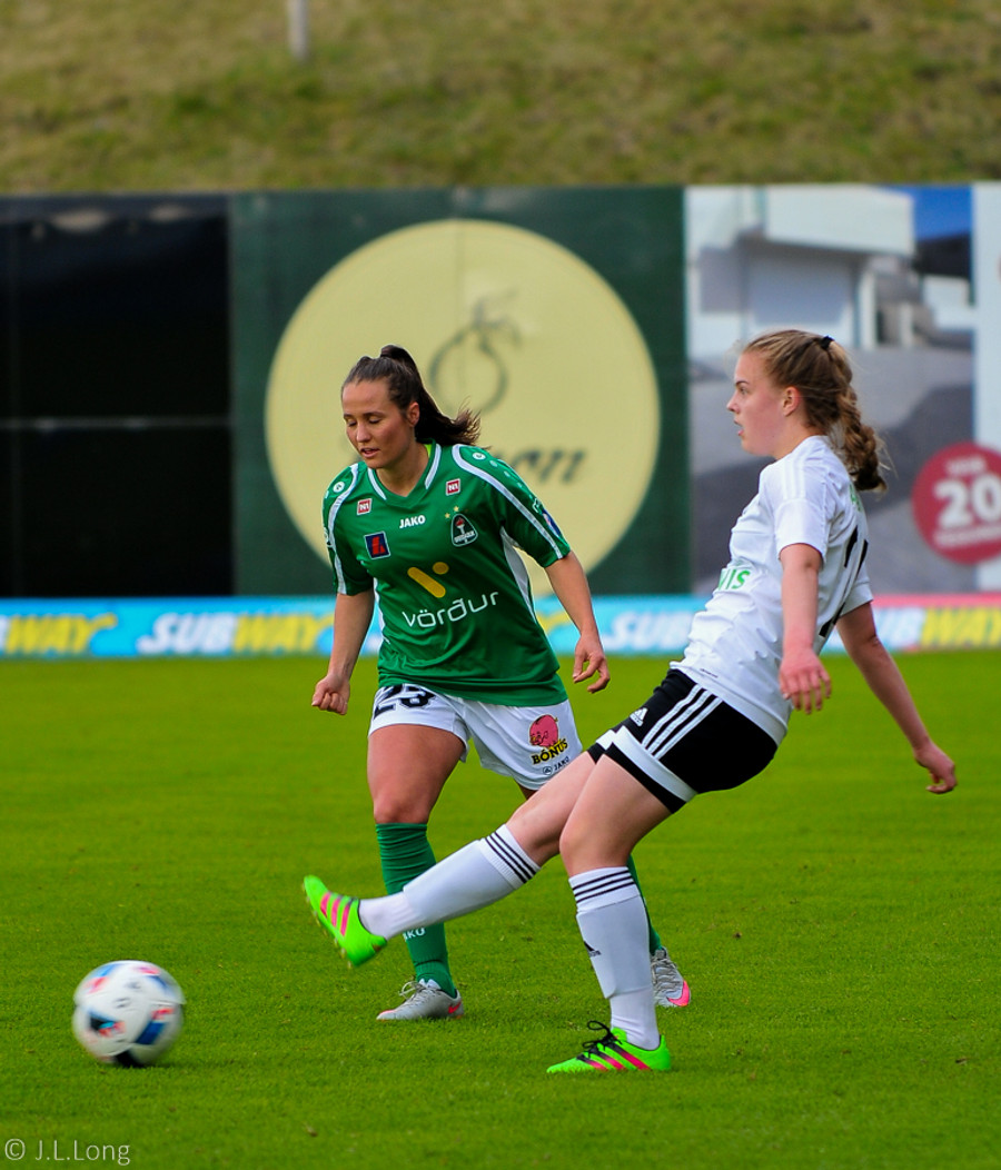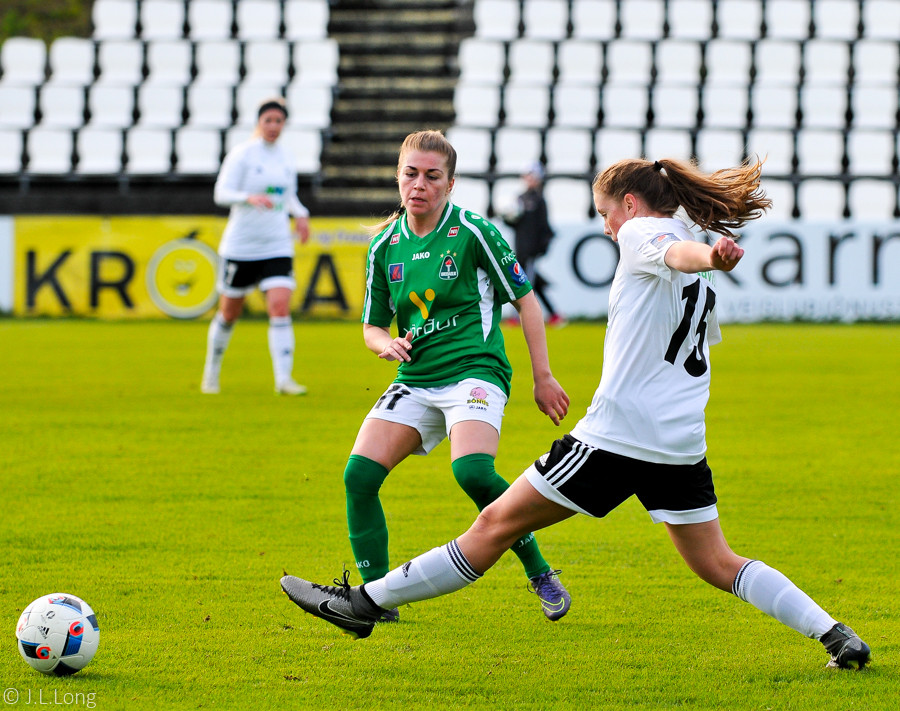 Fanndís með fyrirgjöf inní og Svava kemst í dauðafæri en skýtur í varnarmann og í horn.