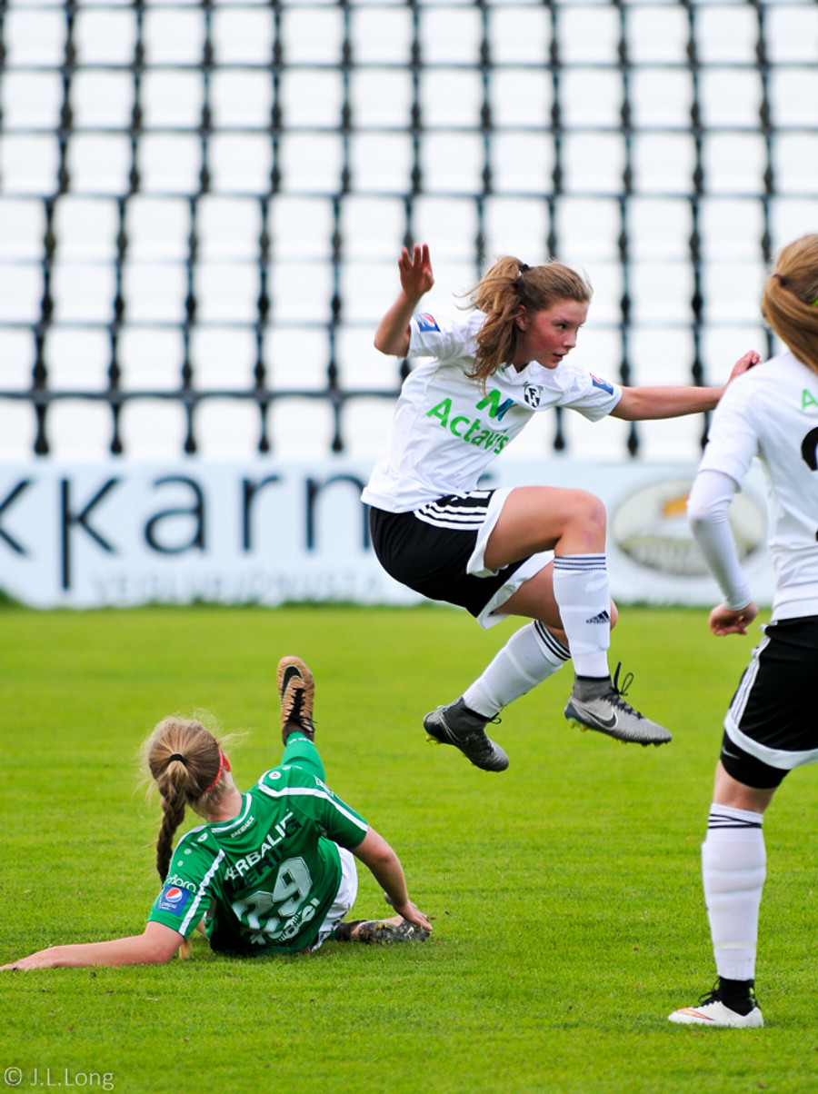 Esther tekur glæsilega á móti boltanum á miðjunni og hleypur upp en vörn FH er þétt og Sigmundína stoppar hana.