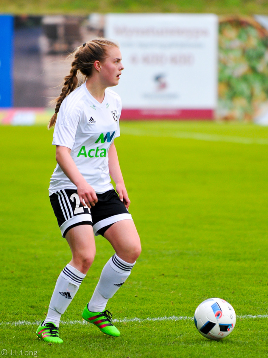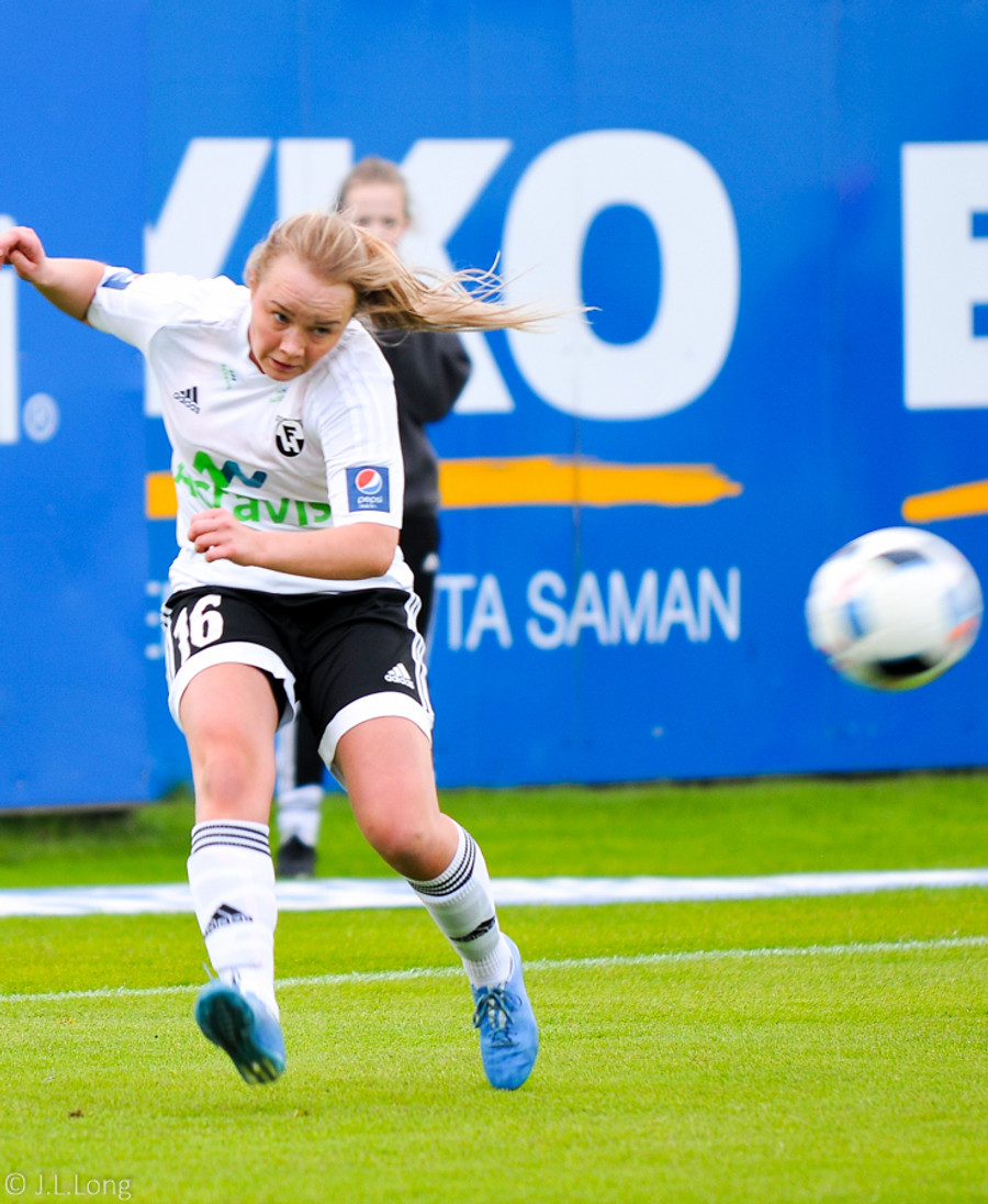 Fanndís gerir vel og keyrir með boltann upp í horn og nær sendingu inn fyrir sem endar síðan í horni.