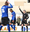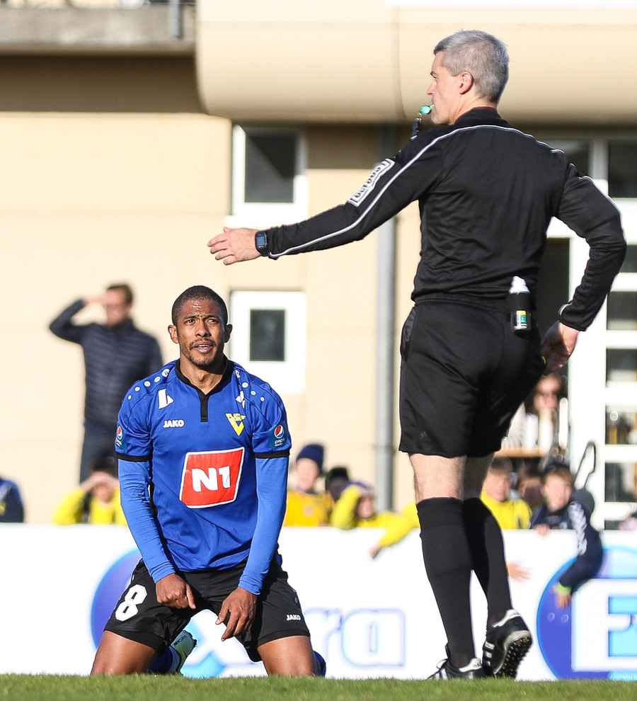 Virðist henda sér niður innan teigs. Martin er steinhissa á þessu og mótmælir af krafti.