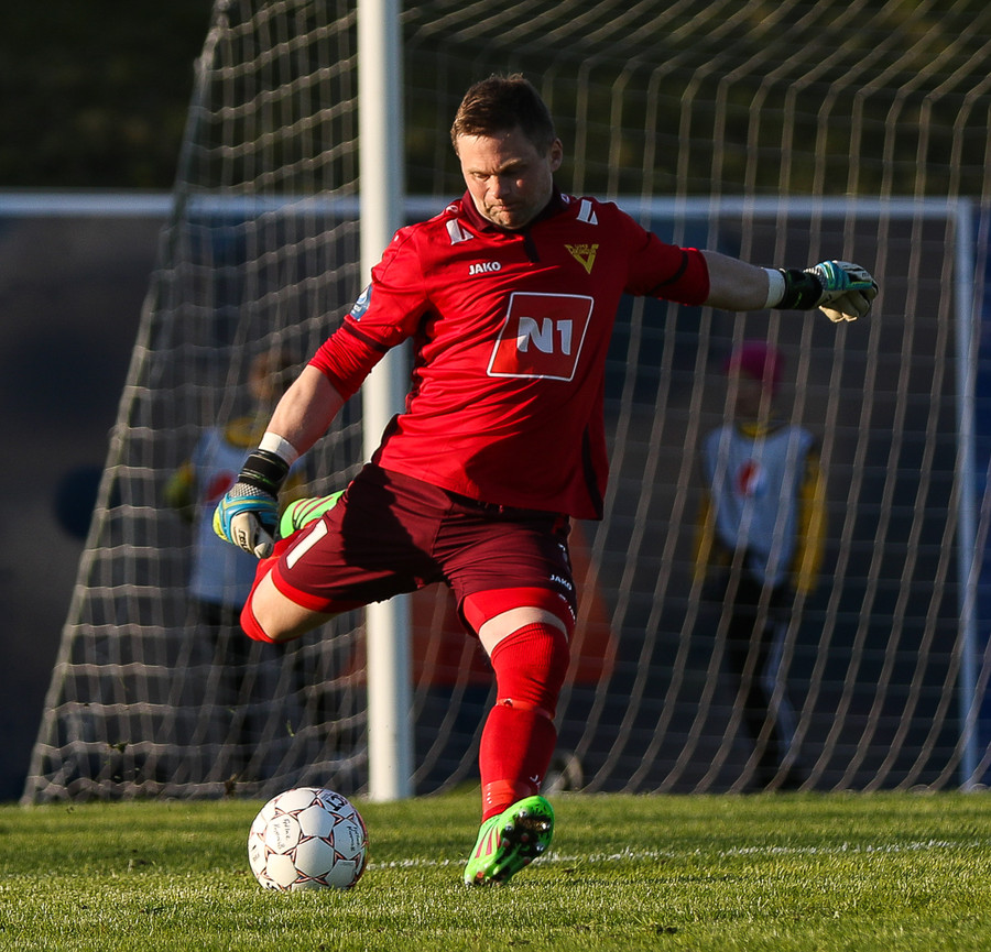 Martin Lund fær boltann vinstra megin í teignum eftir langa fyrirgjöf frá hægri. Martin slúttar á nærstöngina. Einar var í boltanum.