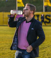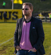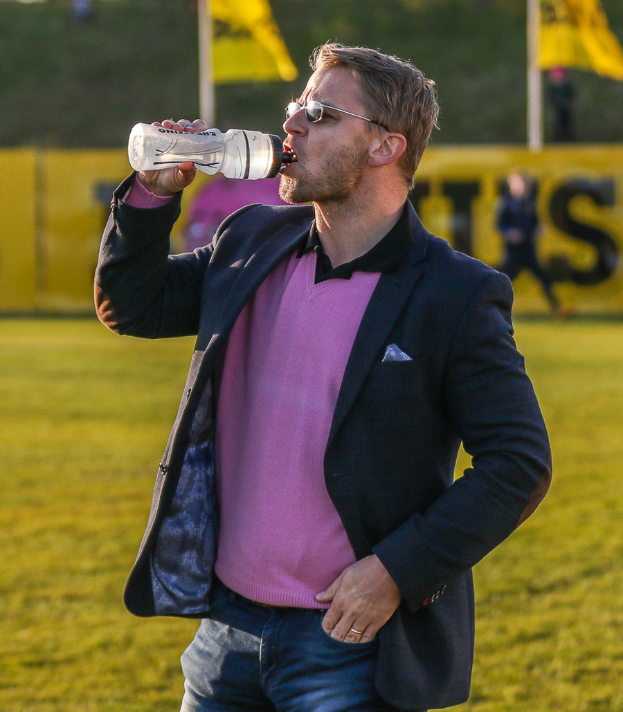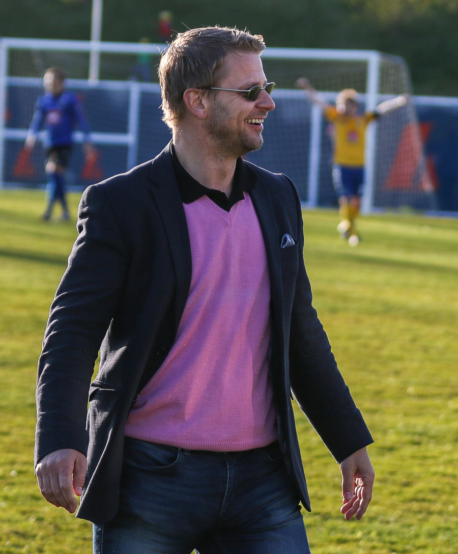 Ágúst Gylfa er í bleikri blússu og glæsilegum jakka. Síðan er hann með sólgleraugu. Hann hlýtur að eiga pantað borð á Grillmarkaðnum beint eftir leik.