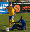 Fær réttilega gult spjald eftir brot á Guðmundi Karli, sem var hársbreidd frá því að komast einn í gegn.