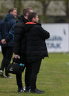 Menn eru að taka síðustu teygjur og spörk út í loftið. Búið að deila út vestum Valsmegin fyrir spileríið en KR eru að labba í átt að keiluvellinum.