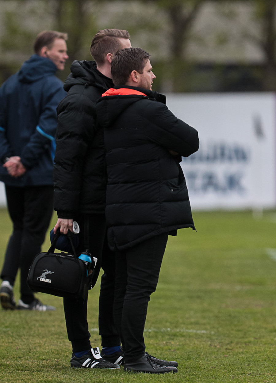Sjúkraþjálfari KR enn á ný kominn inná, Óskar lá eftir að hafa fengið boltann í andlitið af meters færi.