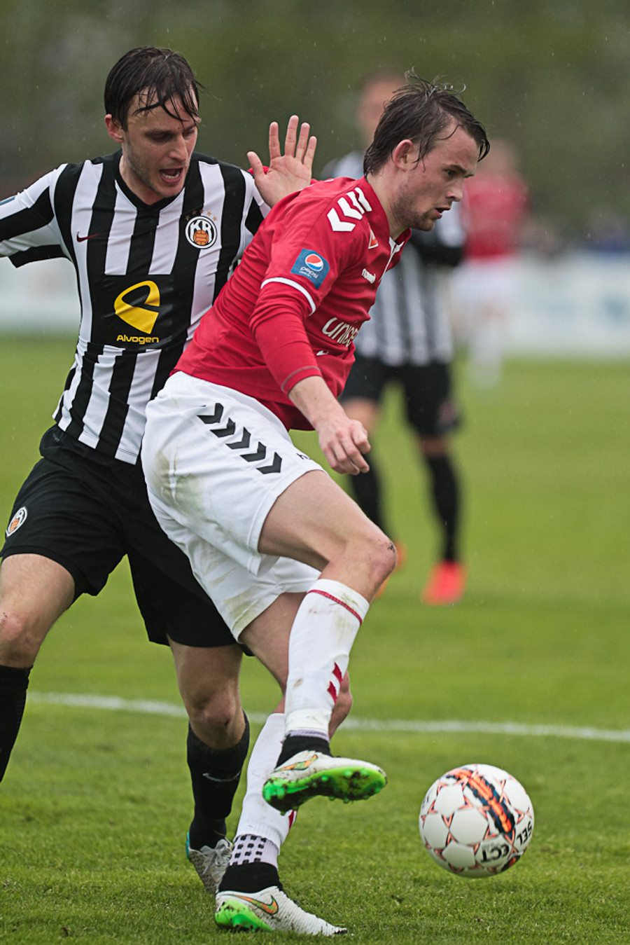 Fazlagic er að sleppa í gegn en Haukur einfaldlega heldur honum föstum á miðjum vallarhelmingi Vals.