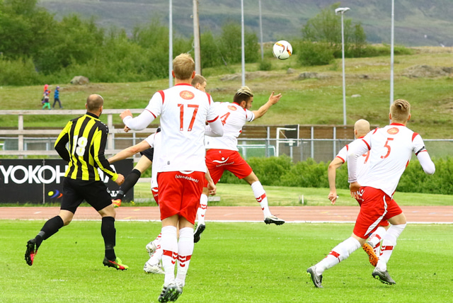 Þórsarar vinna aukaspyrnu við vinstri kantinn. Loftur Páll rís hæst og á skalla yfir markið
