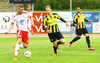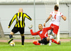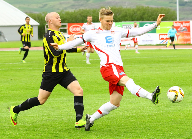 Ármann Pétur með eina af sínum tæklingum á leikmann Hugins og fær að launum gult spjald