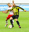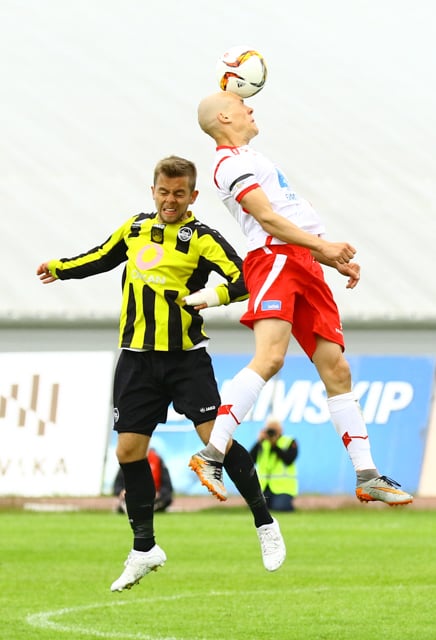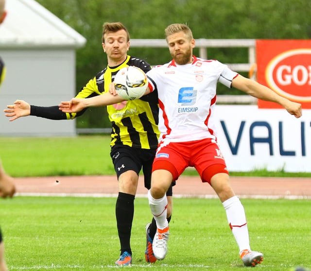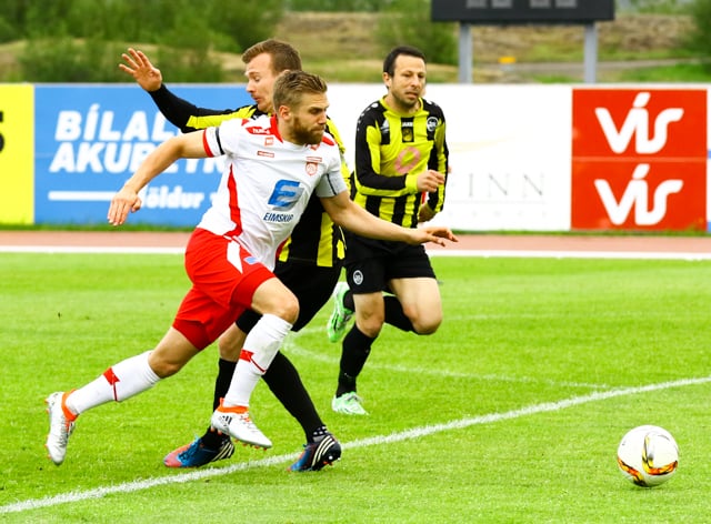 Gunnar Örvar vinnur skallann og sendir Jóhann Helga í gegn. Varnarmenn gestanna fylgja honum fast á eftir og ná að komast fyrir