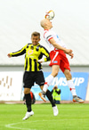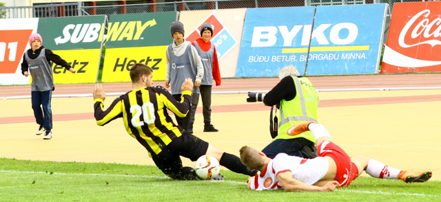 Gauti skellir sér síðan í hörku tæklingu á Nikolic sem liggur eftir og þarfnast aðhlynningar. Gauti fór í boltann en fylgdi hressilega á eftir. Ekkert dæmt samt