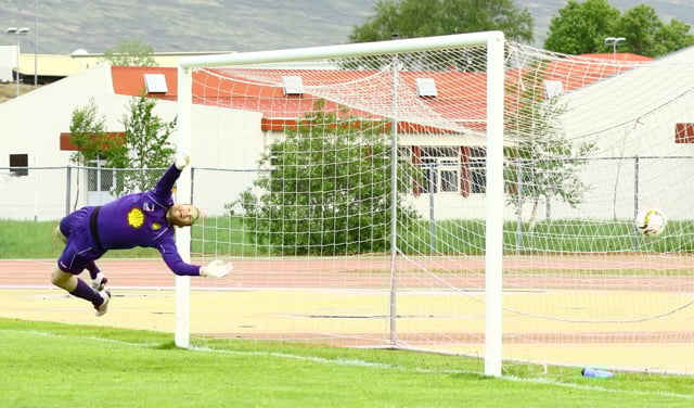 NEI ÞETTA ER EKKI AÐ FJARA ÚT. Það var ekkert að frétta þegar Sveinn Elías kemst inn í teig nær sendingu fyrir á Jóhann Helga sem á skot á lofti. Boltinn bókstaflega lekur inn í markið en Þórsurum er nákvæmlega sama