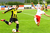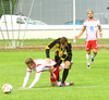 Gunnar Örvar fer af fullum krafti í varnarmann Hugins og vinnur boltann. Keyrir upp völlinn en missir svo boltann of langt frá sér
