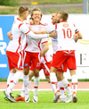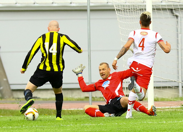 Gestirnir eru komnir yfir! Langt innkast frá Stefáni Ómari sem Gauti skallar yfir Sandor og í markið. Klaufaskapur einfaldlega