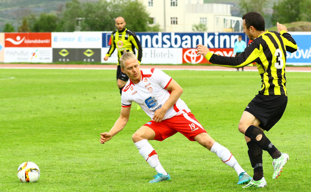 Fer aftaní Kristinn Þór sem var á leiðinni inn í teig. Aukaspyrna á fínum stað fyrir heimamenn