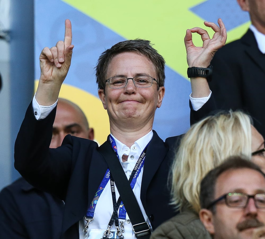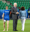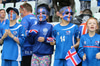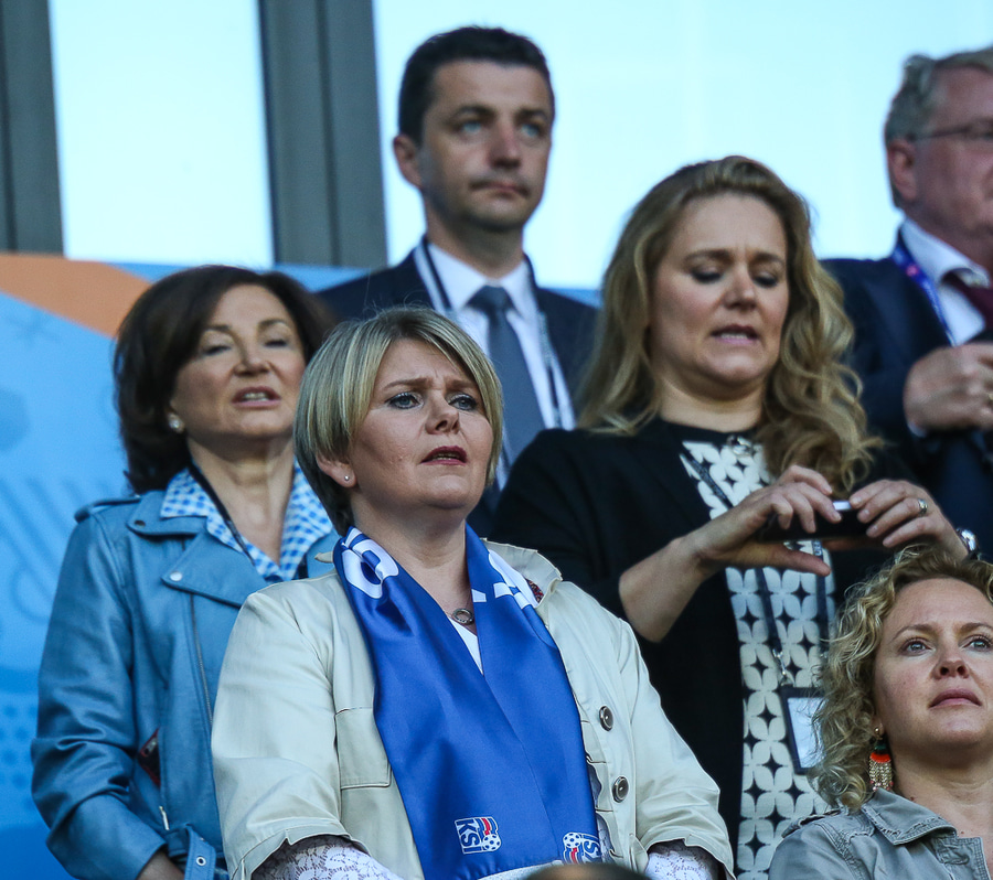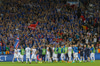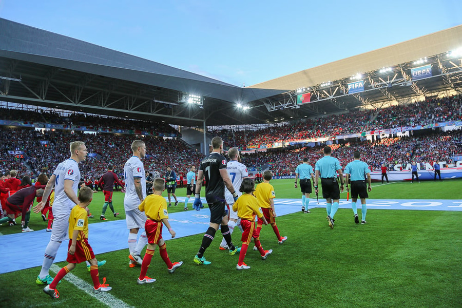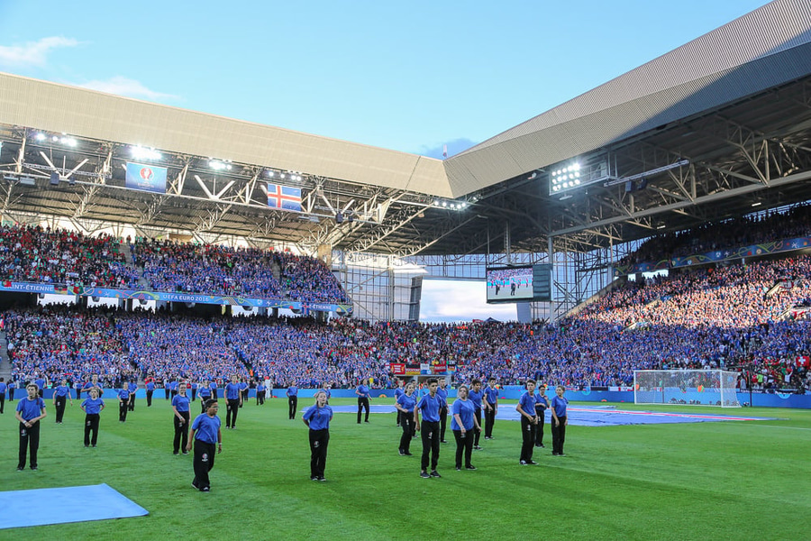 Sýningin er búin, leikmennirnir eru að fara að labba inn á völlinn. Það er næst á dagskrá. Fyrsti leikur liðsins á EM, ever.