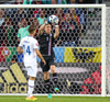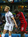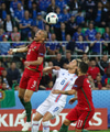Ari Freyr skallar frá. Ísland fær markspyrnu.