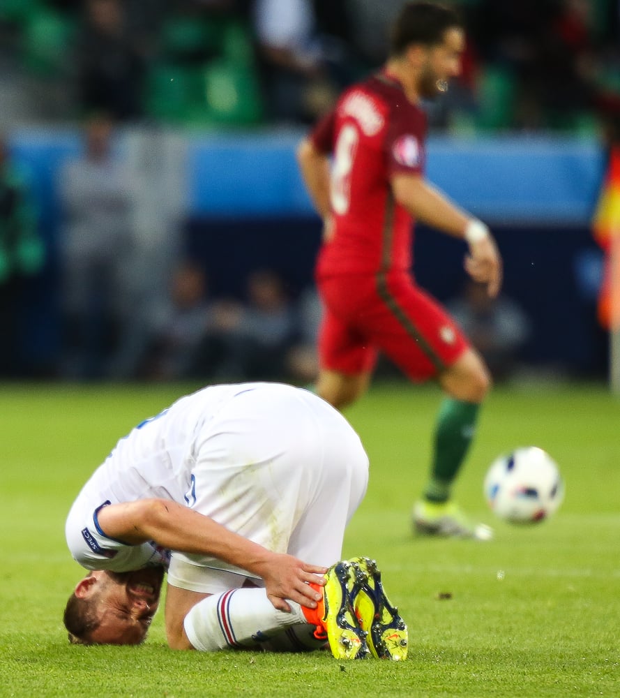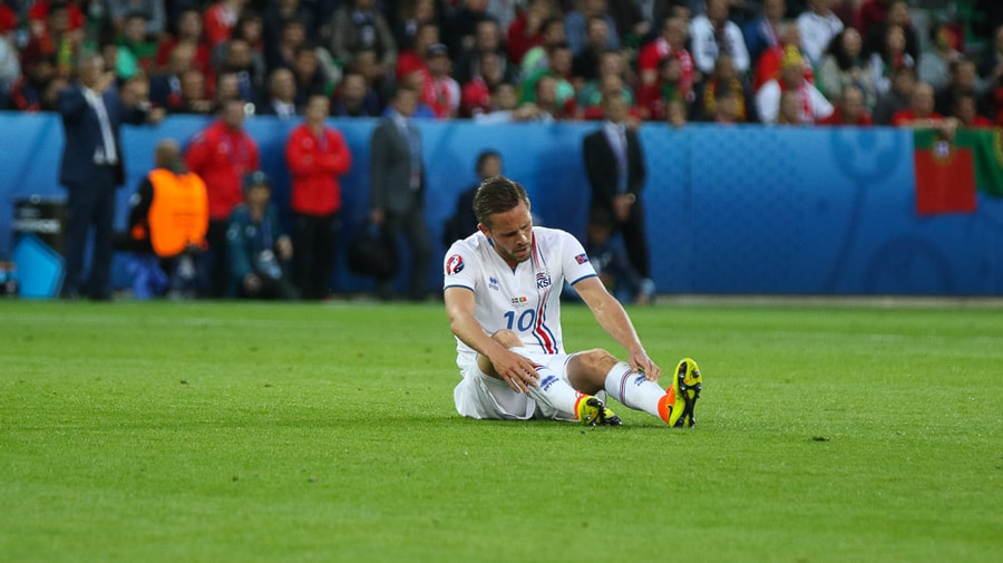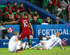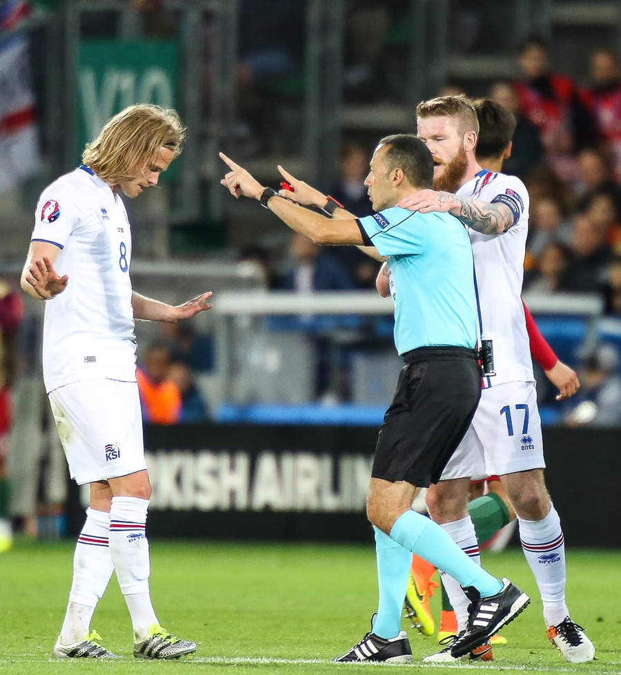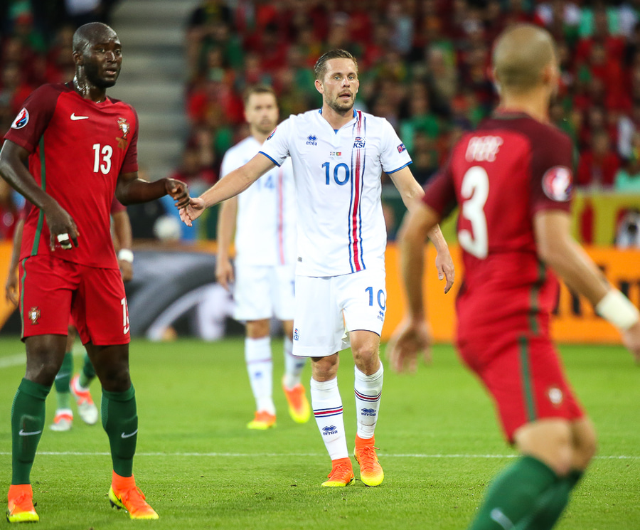 Portúgal er í sókn en dómarinn stoppar leikinn því að Gylfi liggur eftir. Það var augljóslega brotið á Gylfa og hefði því átt að vera aukaspyrna en Portúgalar eru brjálaðir yfir að dómarinn stoppaði leikinn.
