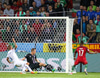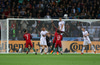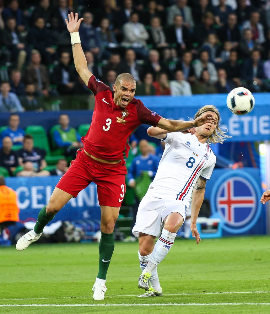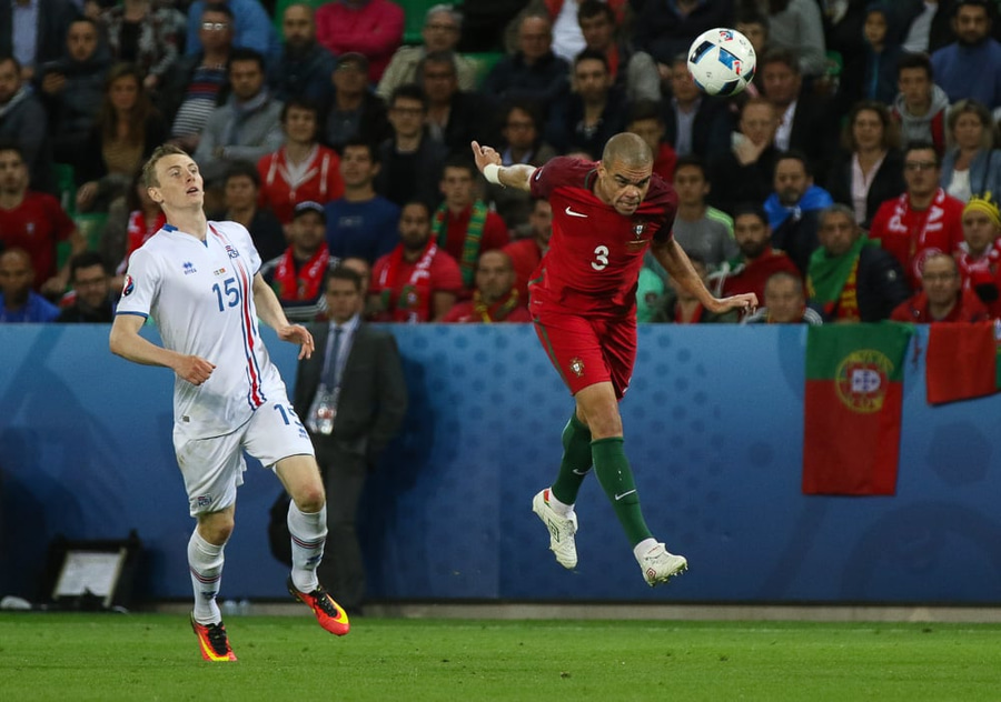 Pepe fær gott skallafæri en skallar yfir, sem betur fer. Viljum ekki að hann skori.