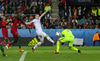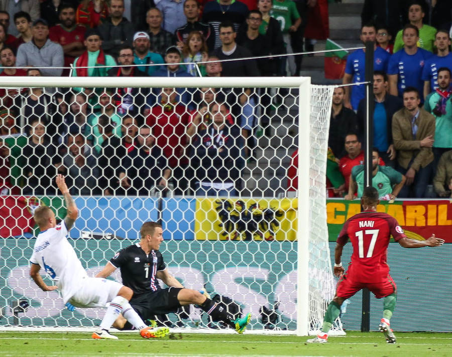 Raphael Guerreiro með fyrirgjöf á Nani sem skallar svona millimeter framhjá. Hjartað í heilli þjóð stoppaði þarna.