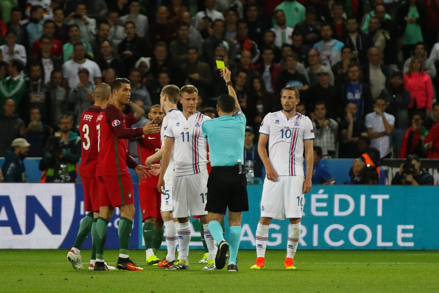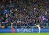 Ronaldo missir boltann útaf við gríðarlega kátínu íslensku stuðningsmannana.