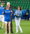 Sýning í gangi. Risastórir búningar beggja liða á vellinum. Mikið ósaplega er sá íslenski fallegur. Við fáum þessa fínu dans sýningu á meðan líka.